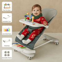 Each Cuddobaby 4-in-1 Baby Bouncer comes with a removable feeding Tray, Tray piano, Pedal base, Foot pedal piano, Basic Cover, and detachable Wheels for easy mobility. All accessories are designed to grow with your baby — from gentle rocking to interactive playtime. It’s not just a baby bouncer chair, but a complete baby activity center for comfort, fun, and development.